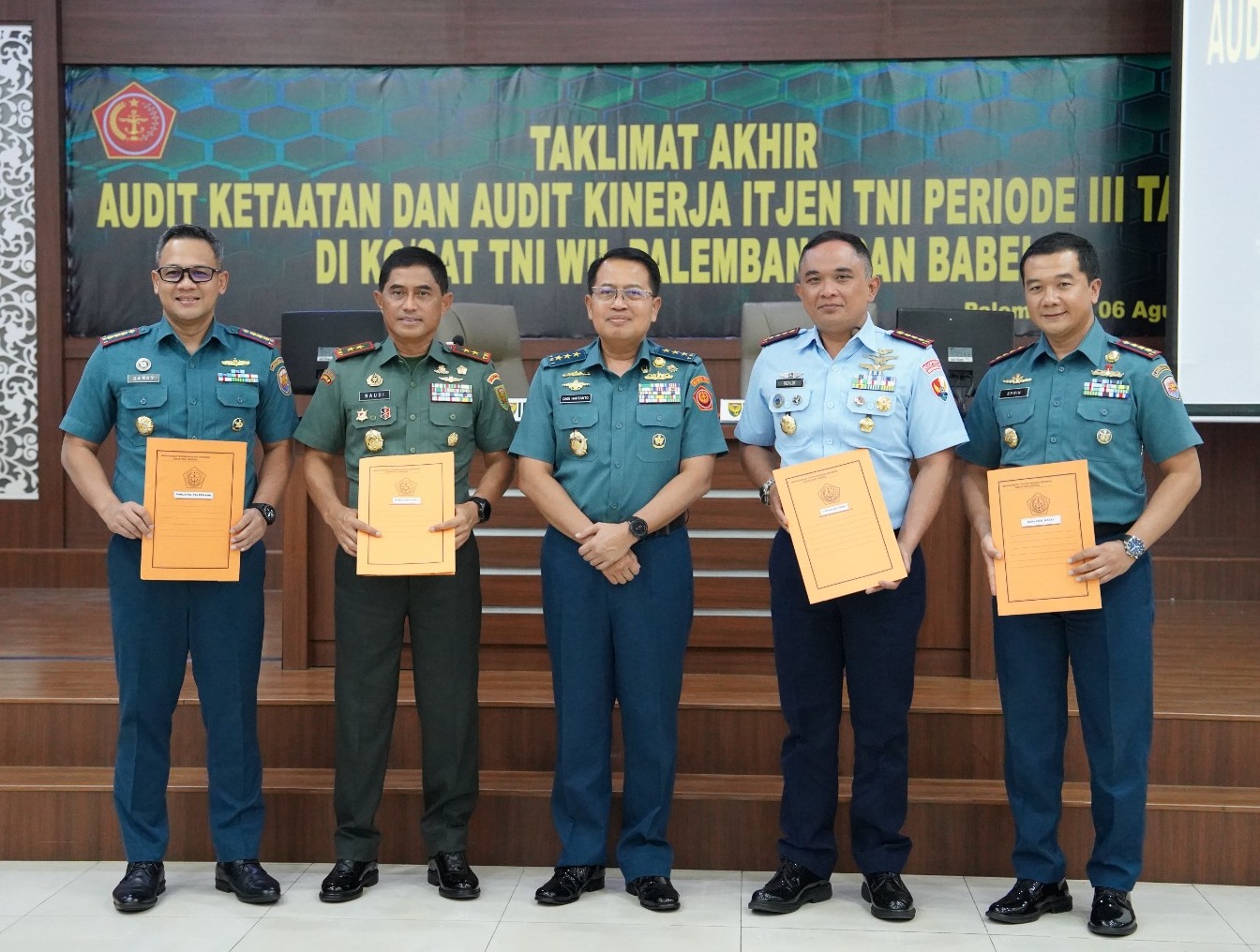 Komandonews.com,Palembang–Tim Audit Ketaatan dan Audit Kinerja Inspektorat Jenderal (Itjen) TNI Periode III TA. 2024 telah selesai melaksanakan tugas audit di satuan-satuan TNI yang ada di wilayah Palembang dan Kep. Bangka Belitung dalam keadaan aman dan lancar.