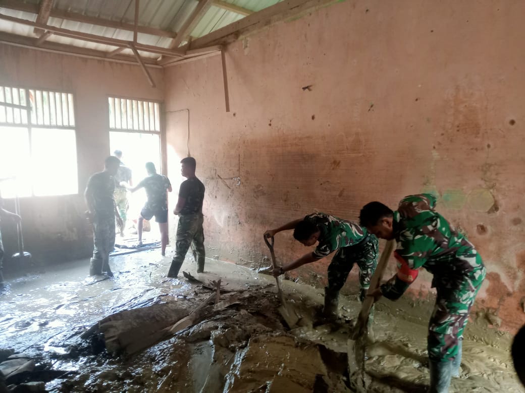 Lumpur yang menutupi sekolah sangat banyak, sehingga membutuhkan waktu beberapa hari untuk membersihkannya. Bersama rekan-rekan tim satgas Gul Bencal dari Yon Tp 852/Aby tim bekerja keras membersihkan lumpur agar guru dan murid dapat beraktivitas kembali seperti biasa.