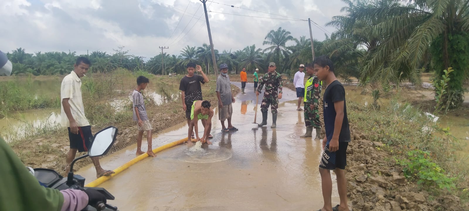 Angota Koramil 03/Seruway Bersama Personil TNI AL Dan Masyarakat Bersihkan Sisa Lumpur di Jalan Pasca Banjir