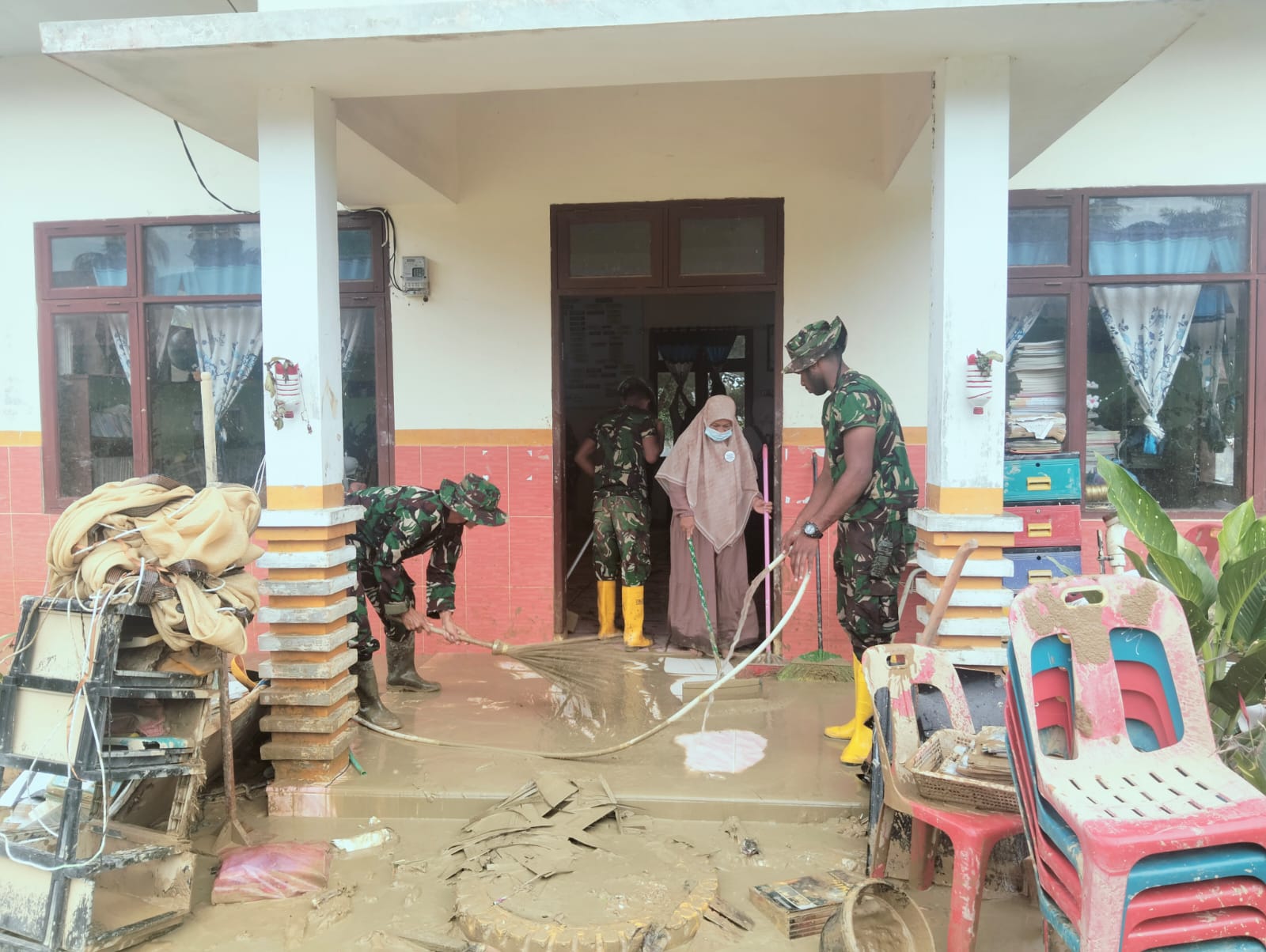 Sekolah yang terdampak banjir mengalami kerusakan pada ruang kelas, halaman, dan fasilitas lainnya akibat lumpur dan sampah yang terbawa air. para anggota TNI yang bertugas sebagai Babinsa itu membersihkan sisa-sisa lumpur, memperbaiki meja dan kursi, serta memastikan lingkungan sekolah kembali layak digunakan oleh siswa.