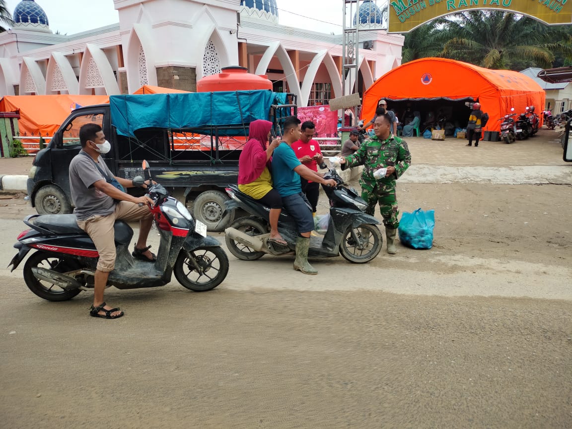 Aceh Tamiang – Babinsa Koramil 08/Rantau, Kodim 0117/Aceh Tamiang Serka Sabar Tri Wibowo membantu mendistribusikan makanan siap saji kepada warga yang melintas depan posko induk Kecamatan di Desa Rantau Pauh, Kecamatan Rantau, Kabupaten Aceh Tamiang. Jumat (19/12/2025).