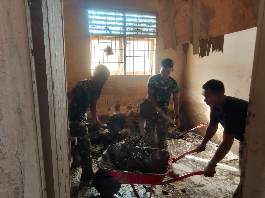 Lumpur yang menutupi sekolah sangat banyak, sehingga membutuhkan waktu beberapa hari untuk membersihkannya. Bersama rekan-rekan tim satgas Gulbencal dari Yon Tp 902/Spg kita terus bekerja keras membersihkan lumpur agar guru dan murid dapat beraktivitas kembali.