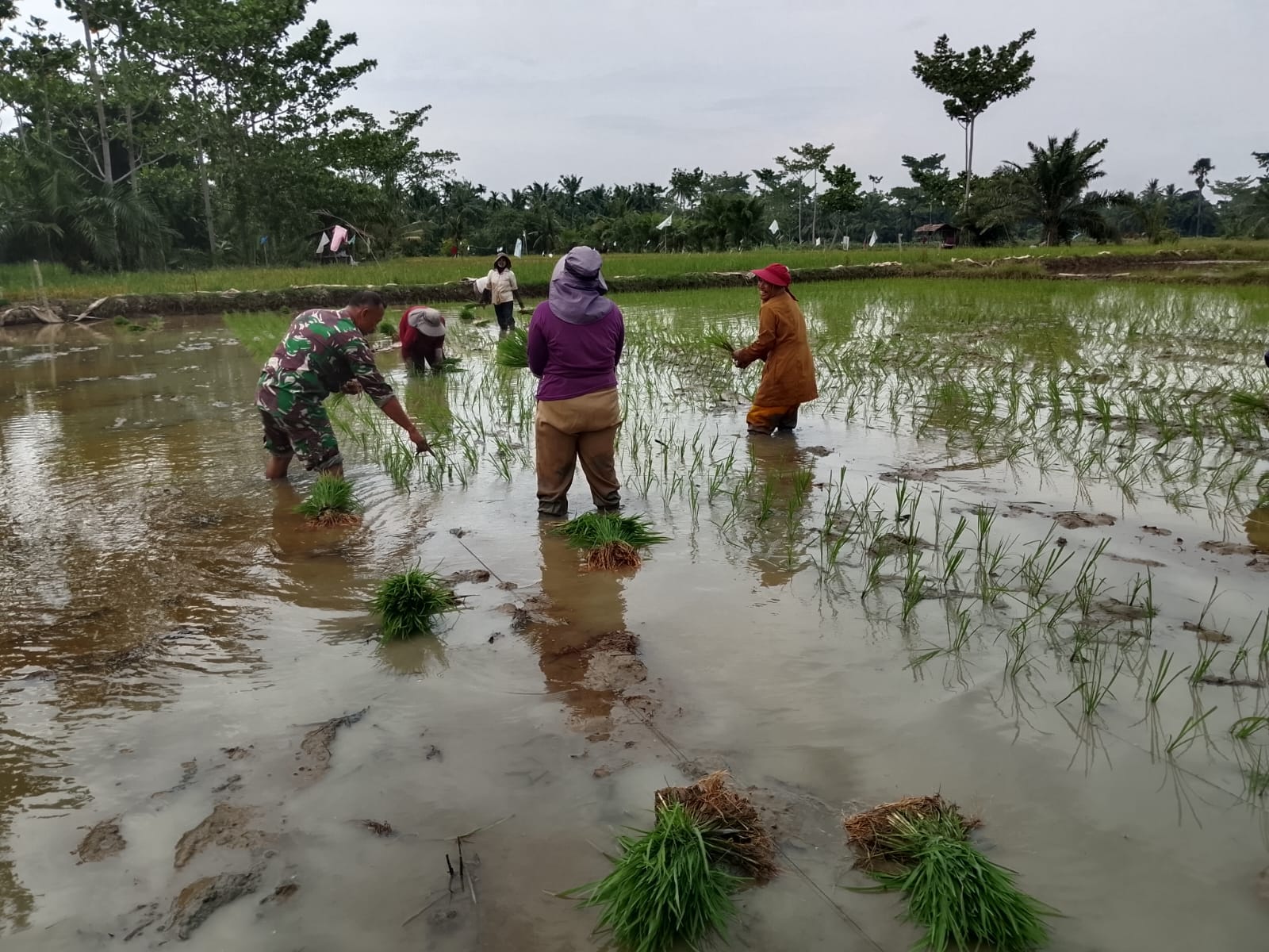 Aceh Tamiang – Guna percepatan masa tanam, Sertu Endri Syaputra Babinsa Koramil 04/Bendahara melaksanakan pendampingan tanam padi di Desa Cinta Raja, Kecamatan Bendahara, Kabupaten Aceh Tamiang. Senin (27/10/2025).