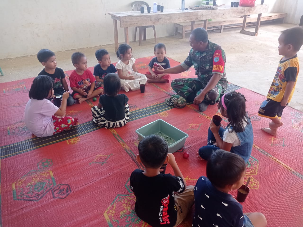 Bengkayang – Sertu I Nengah Santika Babinsa Koramil 07/Jgb Kodim 1209/Bky, menyambangi PAUD Batuh Kasah, Desa Gersik Kec.Jagoi Babang Kab.Bengkayang,