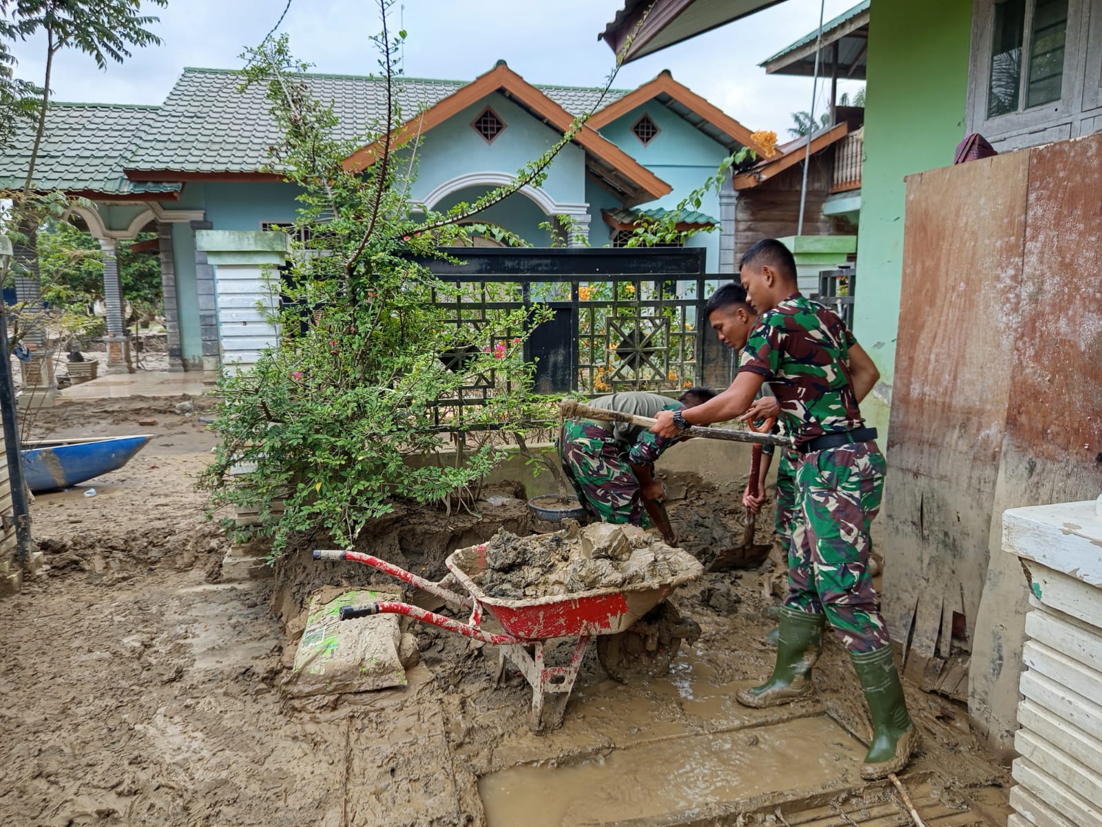 Aceh Tamiang – Sertu Tomi, Babinsa Koramil 04/Bendahara bersama tim satgas Gulbencal dari Batalyon TP 853/BRB dan warga melaksanakan kegiatan gotong royong membersihkan Poskesdes yang terdampak musibah banjir di wilayah desa binaan bertempat di Desa Mesjid Bendahara, Kecamatan Bendahara, Kabupaten Aceh Tamiang. Selasa (13/01/2026).