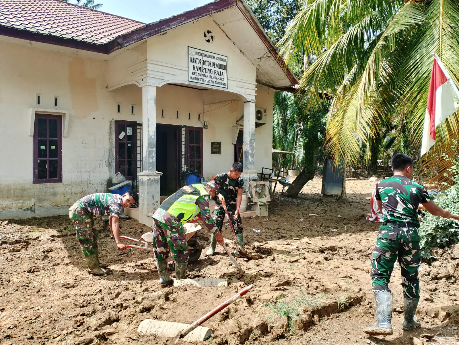 Melihat situasi tersebut, Babinsa Koramil 04/Bendahara bersama tim satgas Gulbencal dari Batalyon TP 853/BRB turun langsung ke lokasi untuk membersihkan lumpur di halaman serta di dalam ruangan Kantor Datuk Penghulu dan area sekitar kantor.