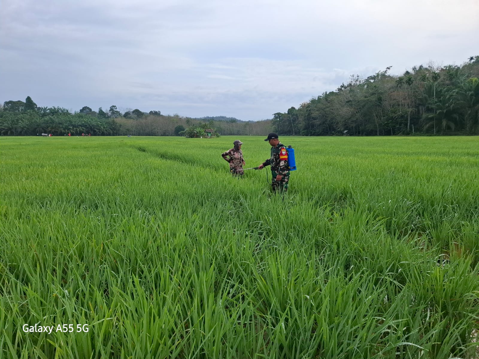Aceh Tamiang – Babinsa Koramil 06/Manyak Payed Serda Zulham Melaksanakan kegiatan Pendampingan pertanian Membantu salah satu anggota Pok Tan Barona mengatasi Hama pada Tanaman padi, di Desa Seuneubok Baro, Kecamatan Manyak Payed, Kabupaten Aceh Tamiang. Rabu (19/11/2025).
