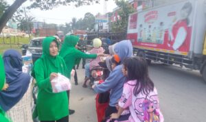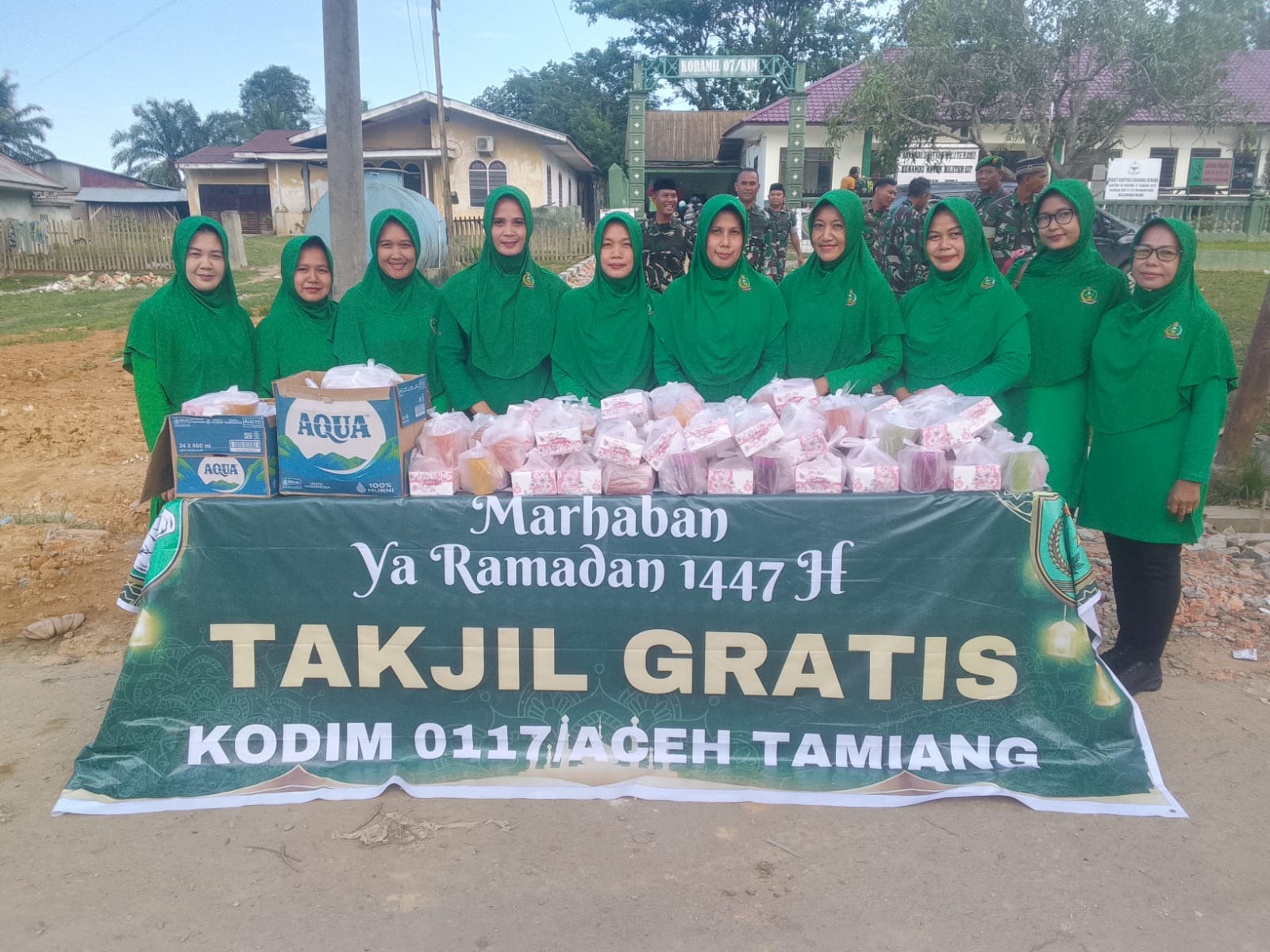 Anggota Koramil 07/Kejuruan Muda bersama Persit turun langsung ke jalan untuk membagikan paket takjil kepada pengendara maupun warga sekitar yang melintas.