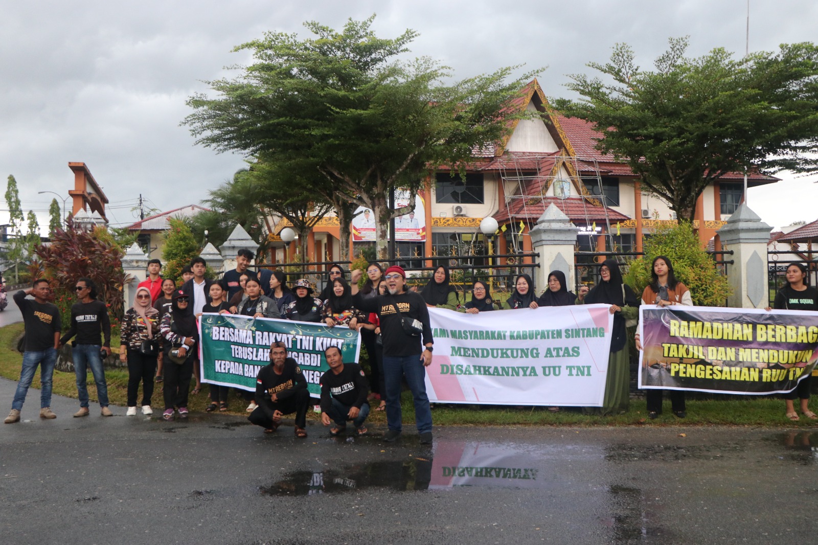 Meski kita tahu bahwa pengesahan UU TNI ini juga menjadi isu yang kemudian cukup krusial, namun sebagai masyarakat yang baik tentunya kita memberikan dukungan dan bersyukur, yang mana salah satunya dengan menggelar bagi takjil di penghujung Ramadan ini, dari pada turun kejalan berdemo tentunya dapat menggangu aktivitas warga yang lainya. saya berharap khususnya di Kabupaten Sintang, revisi UU TNI ini dapat diterima.