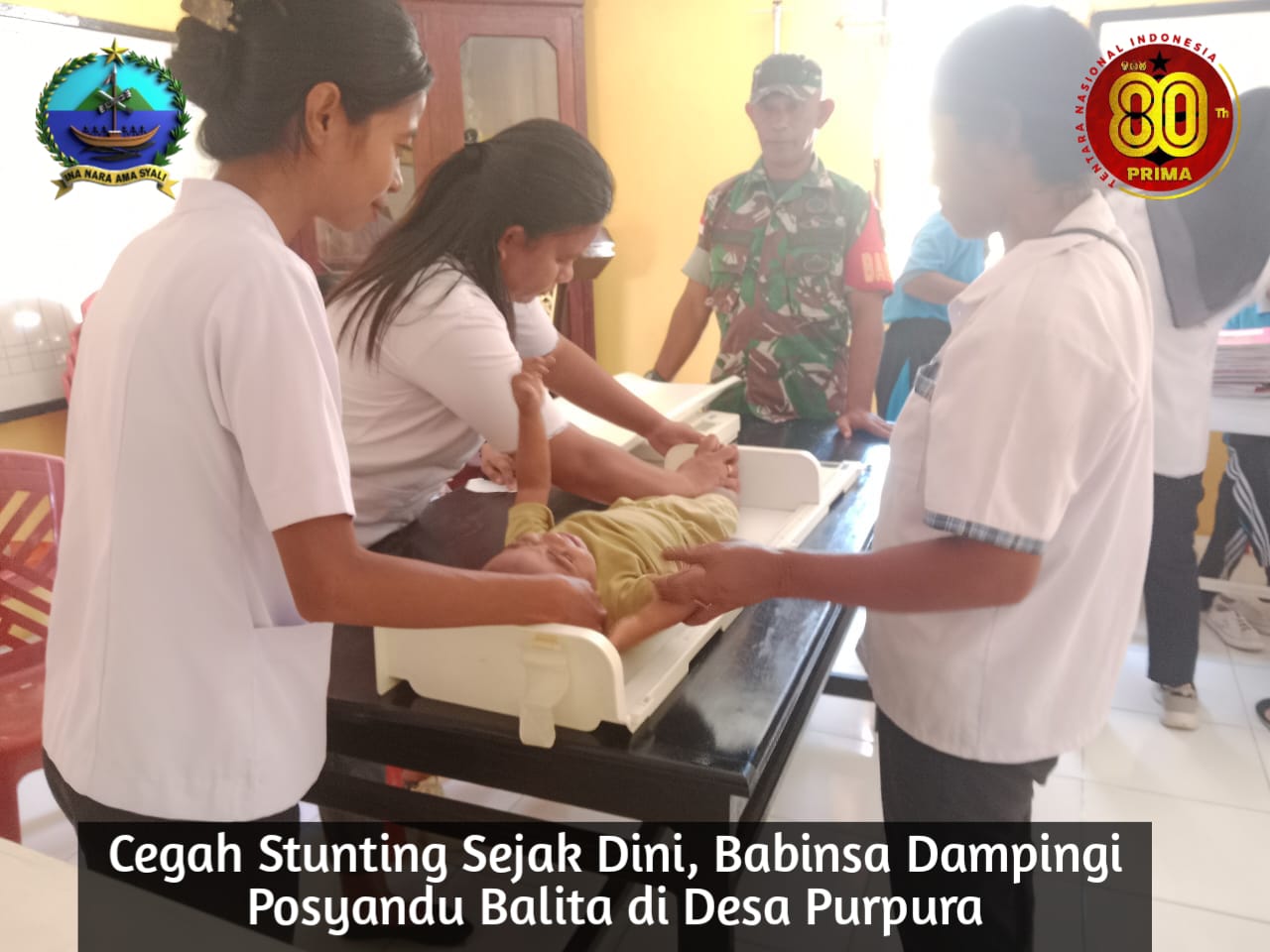 Purpura, komandonews- Dalam upaya mencegah stunting dan meningkatkan kesehatan balita, Sertu Ch. Porumau, Babinsa Desa Purpura dari Koramil 1511-05/Wonreli, aktif mendampingi kegiatan Pos Pelayanan Terpadu (Posyandu) anak balita yang berlangsung di Balai Desa Purpura, Kecamatan Kisar Utara, Kabupaten Maluku Barat Daya 13/10/2025–