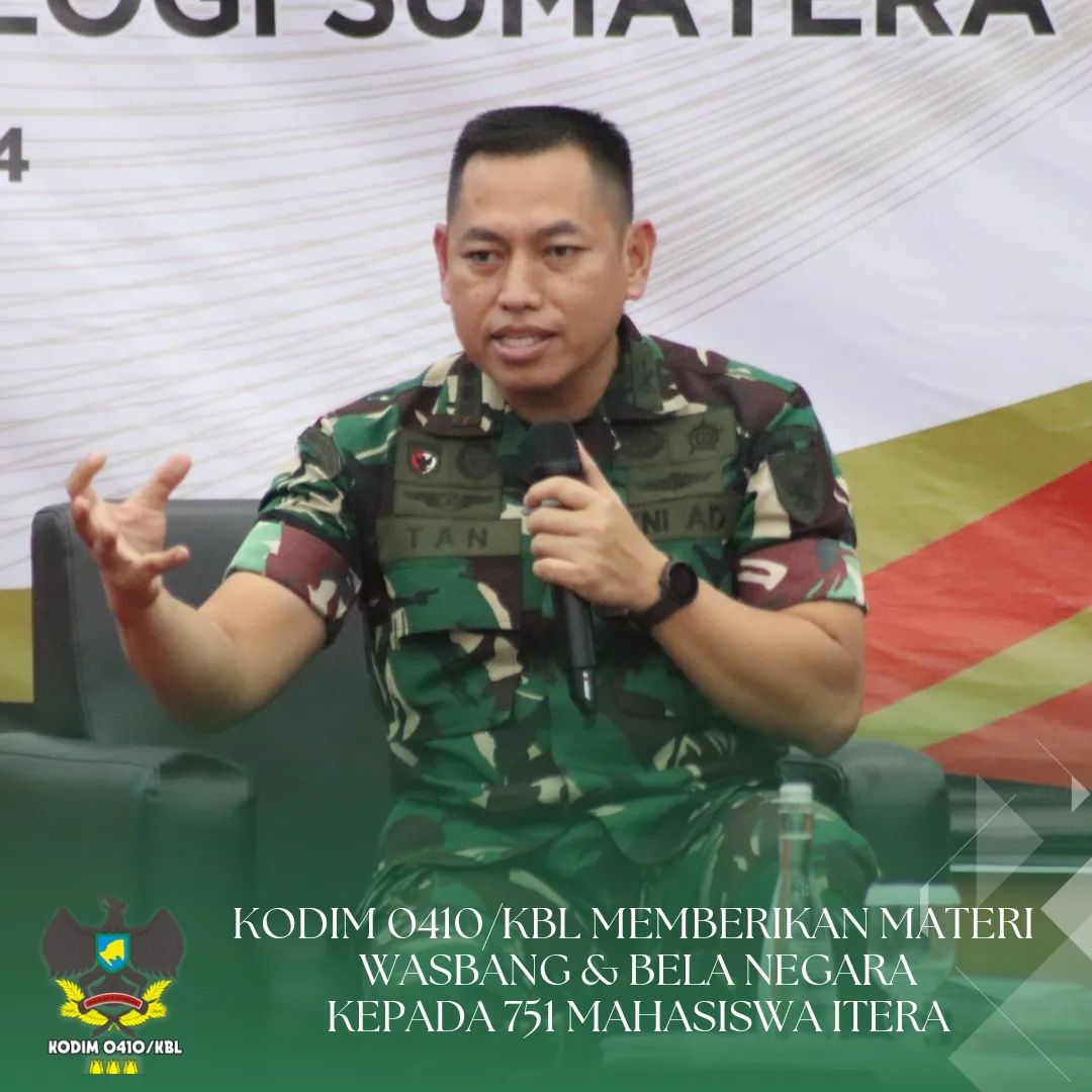 Komandonews.com,Lanpung–Komandan Kodim (Dandim) 0410/Kota Bandar Lampung, Kolonel Arh Tan Kurniawan S.A.P.,M.I.Pol, memberikan materi Wawasan kebangsaan (Wasbang) dalam rangka Pelatihan Kepemimpinan Dan Bela Negara Serta Karya Tulis kepada ratusan mahasiswa di Institut Teknologi Sumatera (Itera), Jl. Terusan Ryacudu, Provinsi Lampung, Senin (25/11/2024)