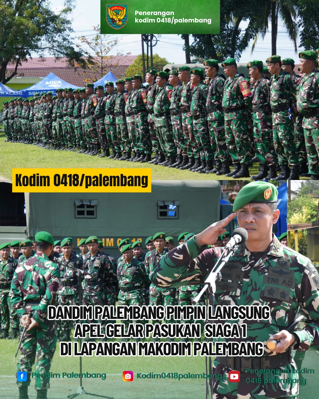 Kegiatan apel berlangsung dengan tertib dan khidmat serta diikuti oleh seluruh personel jajaran Kodim 0418/Palembang.
