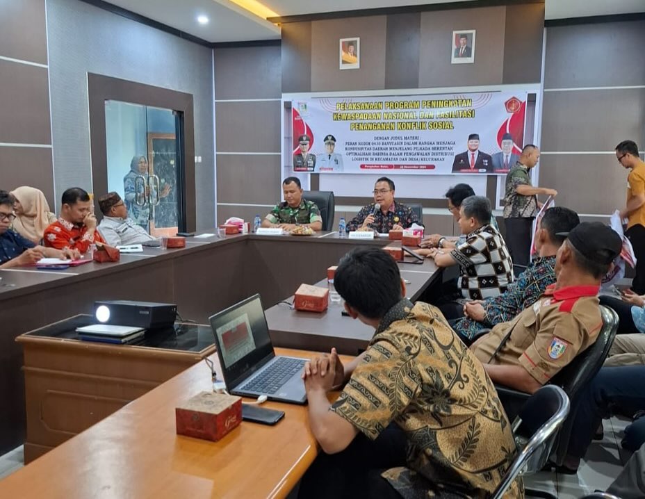 Komandonews.com,Banyuasin–Komandan Kodim 0430/BA, Letkol Inf Roni Sugiarto, hadir sebagai narasumber dalam kegiatan program peningkatan kewaspadaan nasional dan fasilitasi penanganan konflik sosial yang diselenggarakan oleh Badan Kesatuan Bangsa dan Politik (Kesbangpol) Kabupaten Banyuasin. Acara ini berlangsung di Ruang Rapat Kesbangpol Kabupaten Banyuasin. Minggu(8/12/2024)