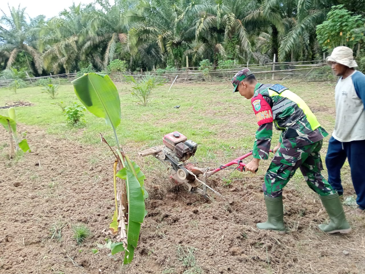 Sebagai bentuk dukungan terhadap program ketahanan pangan Babinsa Koramil 05/Tamiang Hulu Serda Edi Witoko melaksanakan pendampingan kepada salah satu petani saat mengolah lahan di Desa Prupuk, Kecamatan Bandar Pusaka, Kabupaten Aceh Tamiang. Senin (22/09/2025).