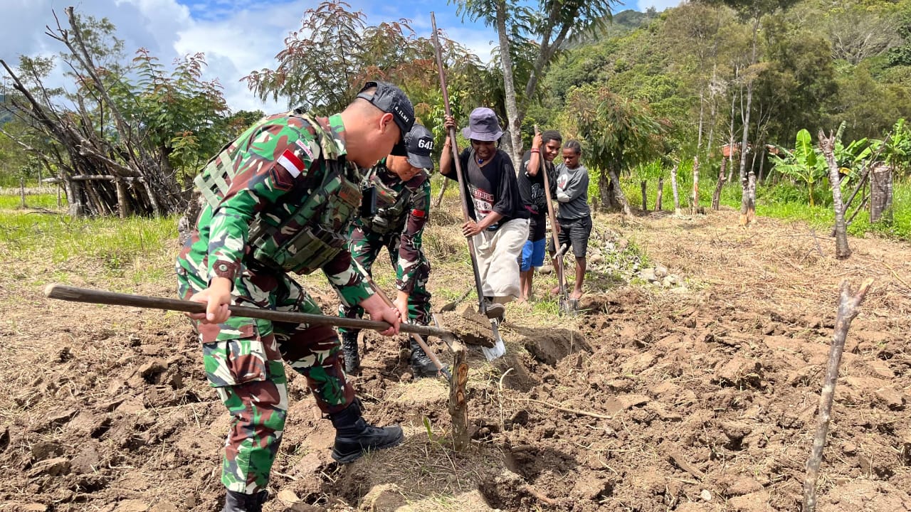 Jayawijaya – Di Kampung Bolakme, Distrik Bolakme, Kabupaten Jayawijaya, Provinsi Papua Pegunungan Papua, Satgas Yonif 641/Beruang melalui Pos Bolakme melaksanakan komsos yang dipimpin oleh Dantim 3 Serda Dandi dalam rangka membantu dan mendampingi petani untuk mengolah lahan pertanian. (6/11/2024).