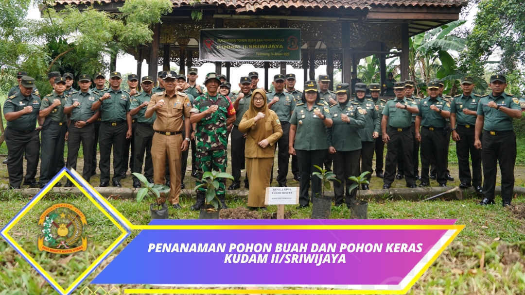 Komandonews.com,Palembang, sebagai wujud dukungan TNI AD terhadap pelesatrian lingkungan dan mendorong Program Ketahanan Pangan Nasional, Kudam II/Swj melaksanakan Penanaman Pohon di area situs Taman Wisata Kerajaan Sriwijaya Palembang,(14/01/2025)