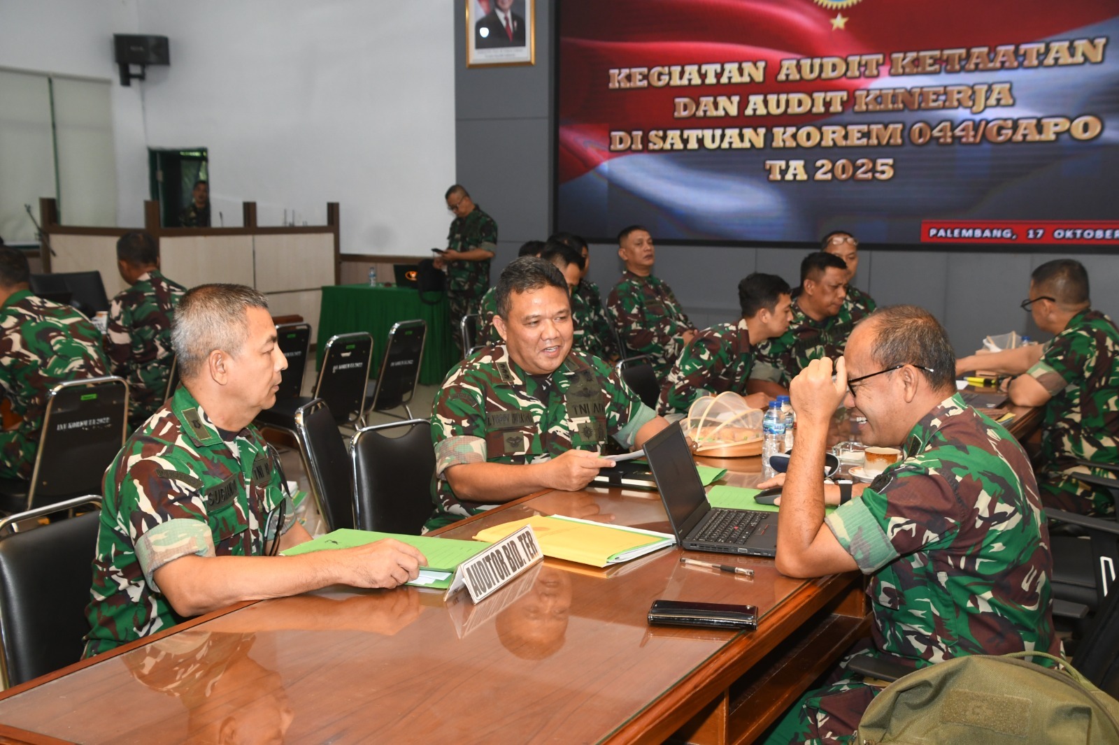 Komandonews.com,Palembang–Kasrem 044/Gapo Kolonel Inf Andi Gus Wulandri menyambut Tim Audit Kinerja Itjenad saat melaksanakan pengawasan / audit terhadap kinerja yang dilaksanakan oleh Korem 044/Gapo dan jajaran, jumat (17/10/2025).