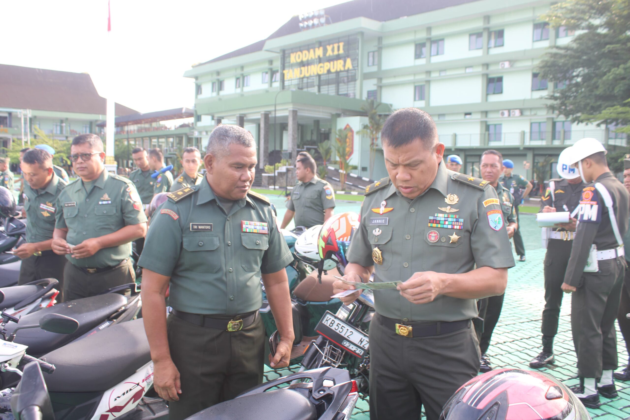 Pemeriksaan ini dilaksanakan oleh personel Pomdam XII/Tpr bersama Provost Kodam XII/Tpr. Ini merupakan bagian dari operasi penegakkan ketertiban (Gaktib) TA 2025. Pemeriksaan dilakukan terhadap kendaraan bermotor roda dua dan roda empat baik dinas maupun pribadi milik personel Kodam XII/Tpr.