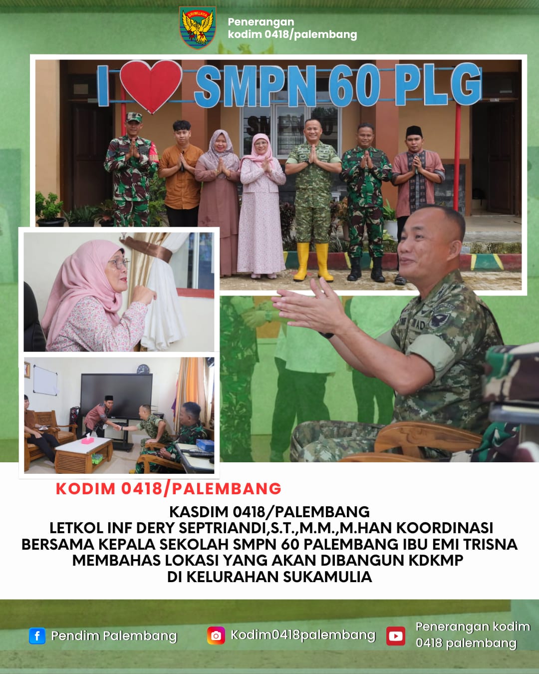Komandonews.com,Palembang–Komando Distrik Militer (Kodim) 0418/Palembang terus memperkuat sinergi dengan berbagai pihak dalam mendukung pembangunan di wilayah. Kali ini, Dandim 0418/Palembang yang diwakili Kasdim Letkol Inf Dery Septriandi, S.T., M.M., M.Han melakukan koordinasi bersama Kepala SMP Negeri 60 Palembang, Ibu Emi Trisna, terkait rencana pembangunan KDKMP di Kelurahan Sukamulya.