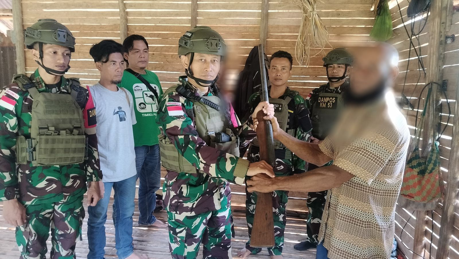 Satgas Yonif 144/JY menerima penyerahan dua pucuk senjata rakitan laras panjang jenis Engkel Looo serta satu buah Bendera Bintang Kejora, dari tiga mantan anggota TPN-OPM Kodap V wilayah Papua Selatan, yakni Sdr. Leonardus Kamonon, Sdr. Januarius Ambipman dan Sdr. Pitalis Awyopin.