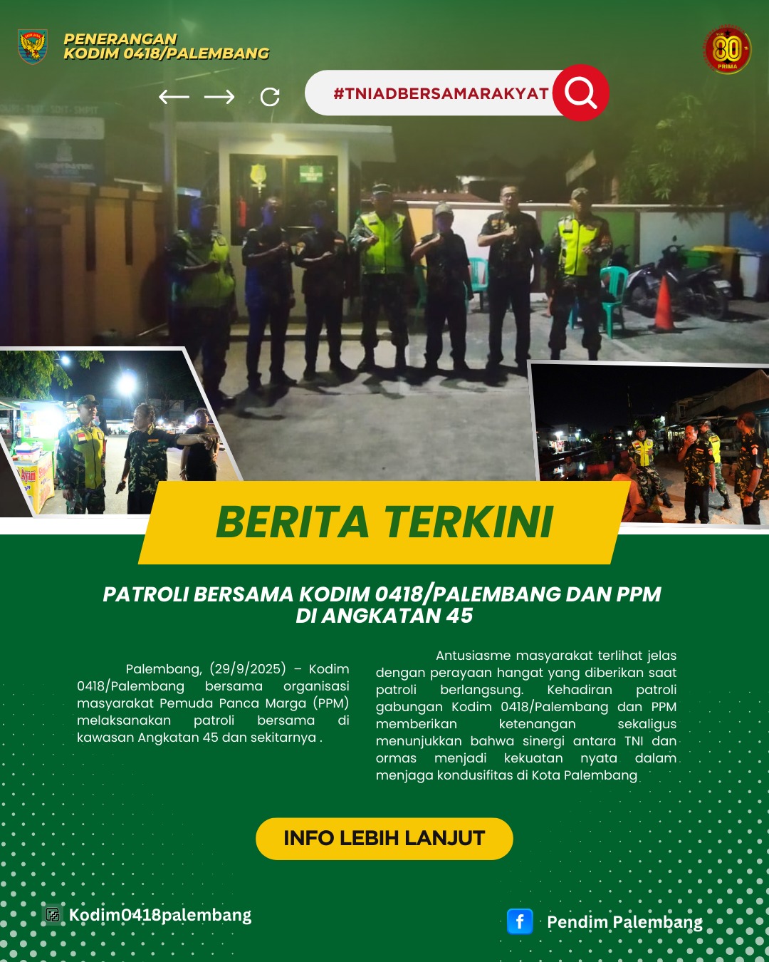 Kali ini, patroli melintasi kawasan strategis Jalan Angkatan 45 dan sekitarnya, salah satu ruas jalan yang ramai dengan aktivitas masyarakat baik di siang maupun malam hari. Dengan penuh kekompakan, personel TNI dari Kodim 0418/Palembang bersama anggota PPM menyapa warga yang ditemui sepanjang rute, serta menyampaikan pesan-pesan humanis agar masyarakat tetap menjaga dan menghindari kegiatan yang berpotensi mengganggu keamanan lingkungan.