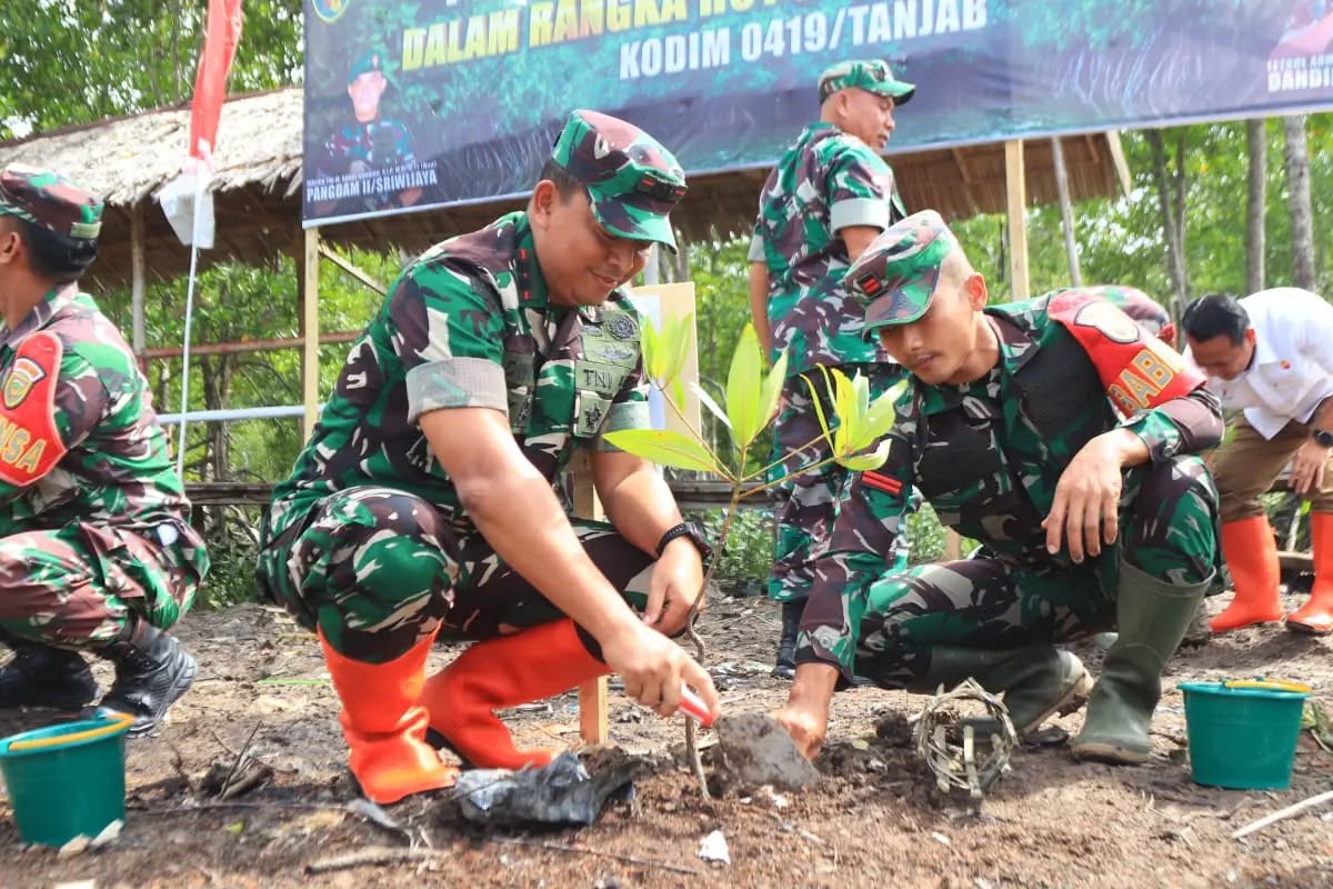 Komandonews.com,Tanjab-Dalam rangka memperingati HUT Kodam II/Sriwijaya ke-79, Kodim 0419/Tanjab melaksanakan kegiatan penanaman mangrove di kawasan Pantai Kelapa Parit 9, Desa Tungkal I, Kecamatan Tungkal Ilir, Kabupaten Tanjab Barat, Jumat (20/12/2024)