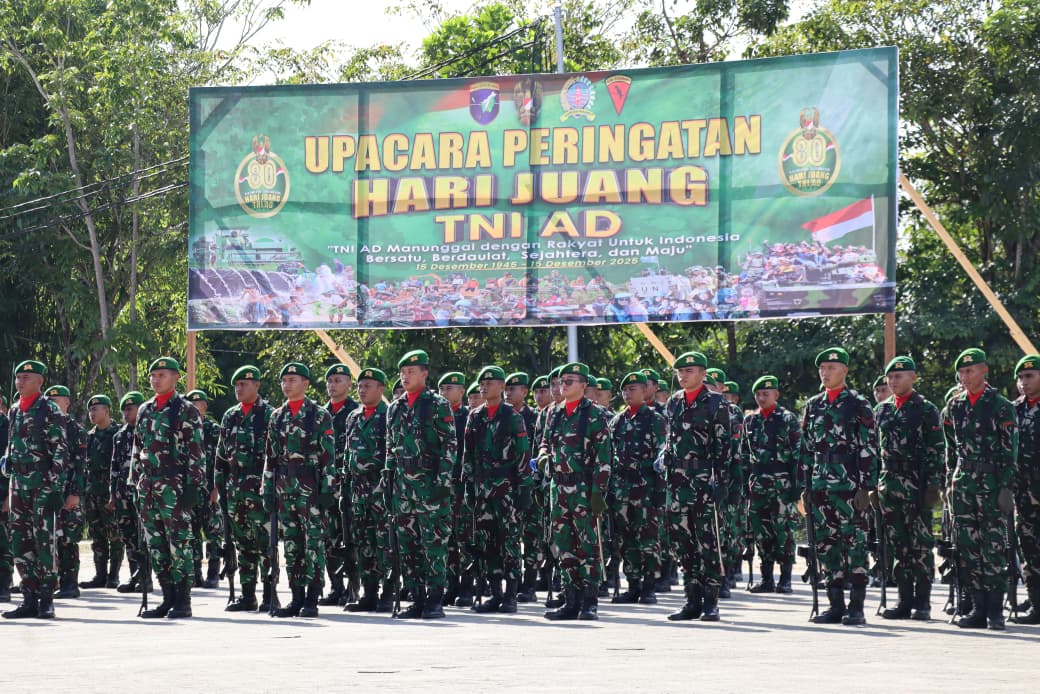 Sanggau – Kodim 1204/Sanggau melaksanakan Upacara Peringatan Hari Juang TNI Angkatan Darat Tahun 2025 yang berlangsung khidmat di Lapangan Tribun Sabang Merah, Kelurahan Bunut, Kecamatan Kapuas, Senin (15/12/2025) pagi.