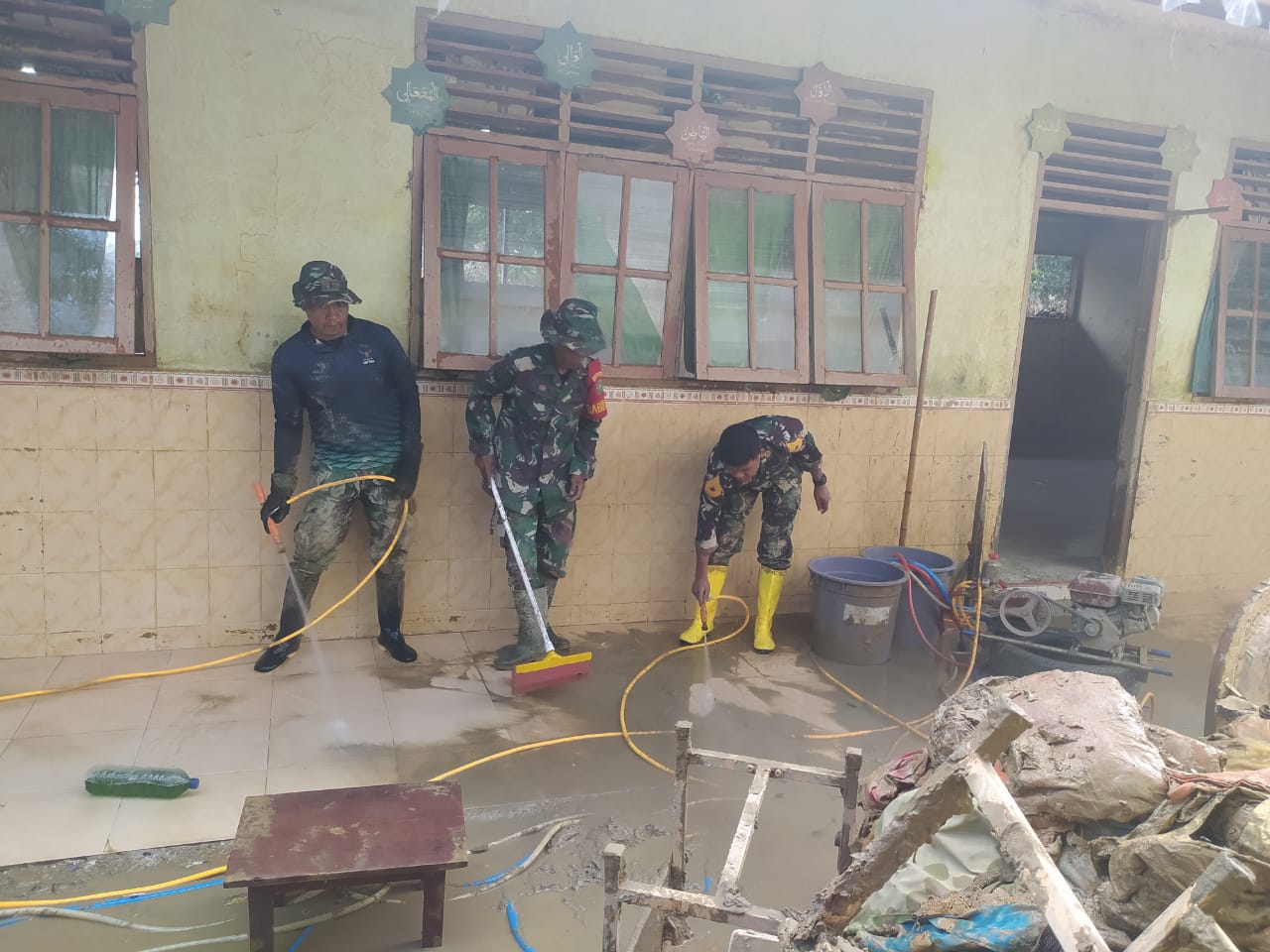 Pasca Banjir, Babinsa Koramil 02/Karang Baru Sigap Bersihkan Sekolah Agar Siswa Bisa Kembali Belajar