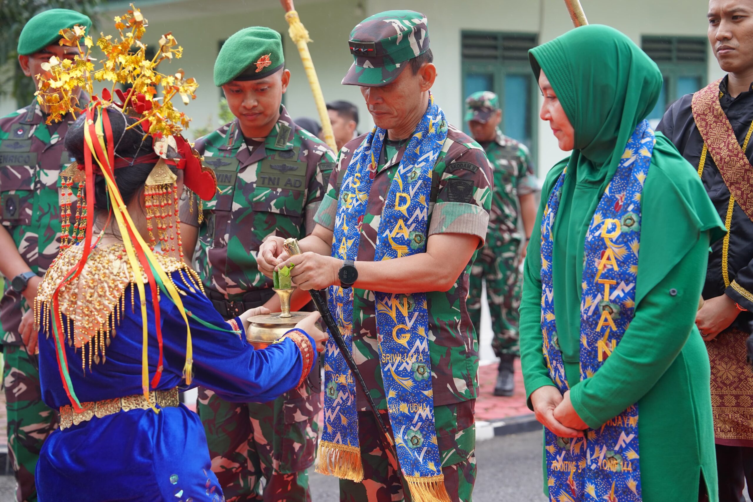 Agenda selanjutnya, Pangdam II/Sriwijaya dan rombongan disambut oleh seluruh prajurit Yonif 144/JY serta segenap Persit KCK Cabang XX PD II Sriwijaya yang dilanjutkan dengan menerima persembahan Tarian Adat.