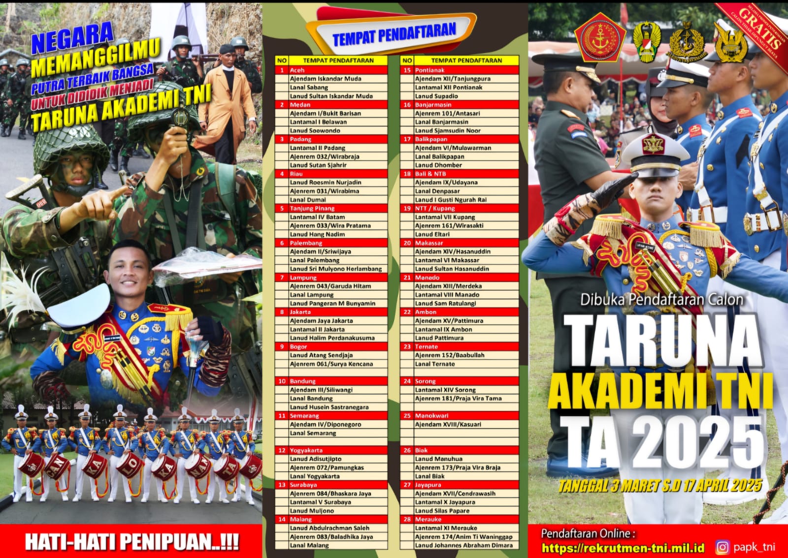 Komandonews.com,Palembang–Tentara Nasional Indonesia (TNI) kembali membuka kesempatan bagi putra terbaik bangsa untuk bergabung sebagai Taruna Akademi TNI Tahun Akademik 2025. Ini adalah peluang emas bagi generasi muda yang bercita-cita menjadi garda terdepan dalam menjaga kedaulatan negara. Palembang (4/3/2025).