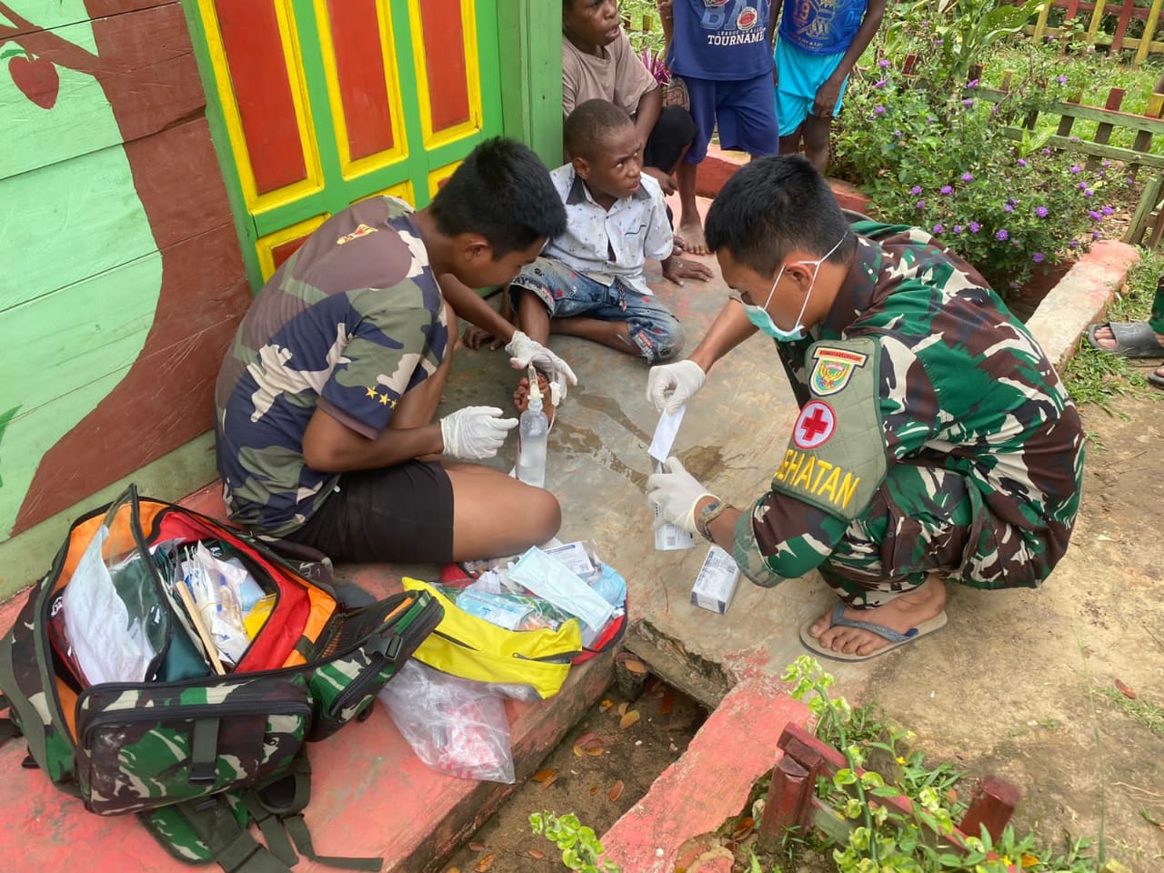 Komandonews.com,Sahakipiya–Kampung Sahakipiya, Distrik Venaha (99671), (5 September 2024), Dalam rangka memastikan keselamatan dan kesehatan anak terkena sajam yang bernama “Titus”, Tim kesehatan Pos Venaha Satgas Pamtas RI-PNG Yonif 141/AYJP memberikan penanganan medis yang cepat dan tepat. Penanganan yang efektif penting untuk mencegah komplikasi dan memastikan pemulihan yang optimal.