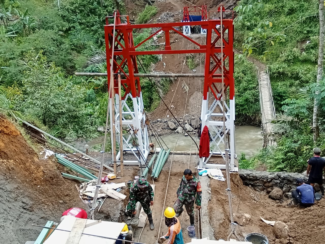 Banjarnegara – Kebersamaan prajurit Kodim 0704/Banjarnegara dan masyarakat kembali terpatri dalam pembangunan Jembatan Gantung Garuda sepanjang 70 meter di atas Sungai Brakah.
