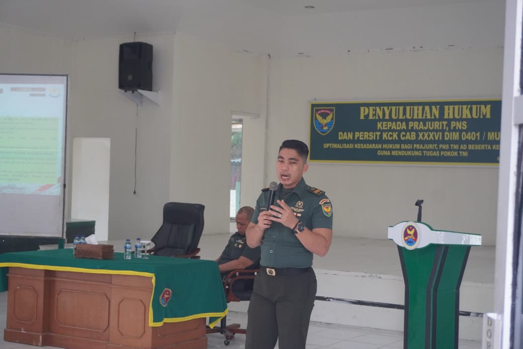 Dalam penyampaiannya Dandim menyampaikan terima kasih kepada Tim penyuluh telah meluangkan waktu untuk memberikan penyuluhan hukum kepada prajurit Kodim 0401/Muba, selanjutnya beliau juga berpesan agar prajuritnya mengikuti penyuluhan dengan baik agar melek hukum.