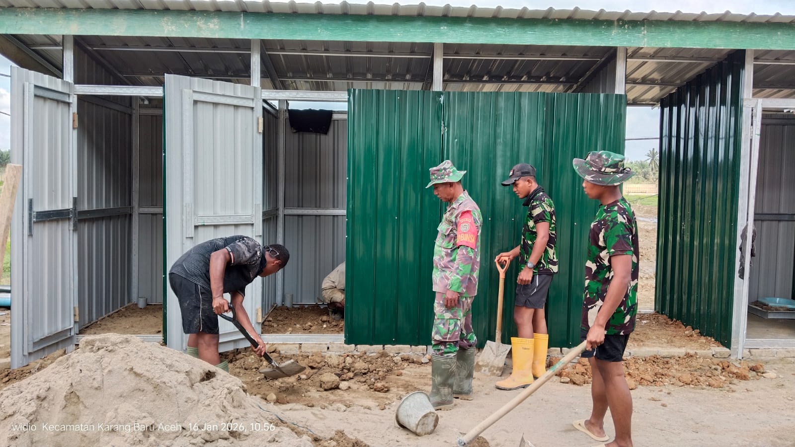 Aceh Tamiang – Upaya pemulihan pasca bencana banjir bandang dan longsor di Kabupaten Aceh Tamiang terus dilakukan. Satuan Tugas Penanggulangan Bencana Alam (Satgas Gulbencal) Kodam Iskandar Muda yang terdiri dari Kodim 0117/Aceh Tamiang, Zidam Iskandar Muda, Yonif Tp 899/DS dan Masyarakat bahu membahu gotong royong membangun tiga unit fasilitas mandi, cuci, kakus (MCK) bagi masyarakat terdampak bencana di Desa Desa Kebun Tanah Terban, Kecamatan Karang Baru. Kabupaten Aceh Tamiang. Sabtu (17/01/2026).