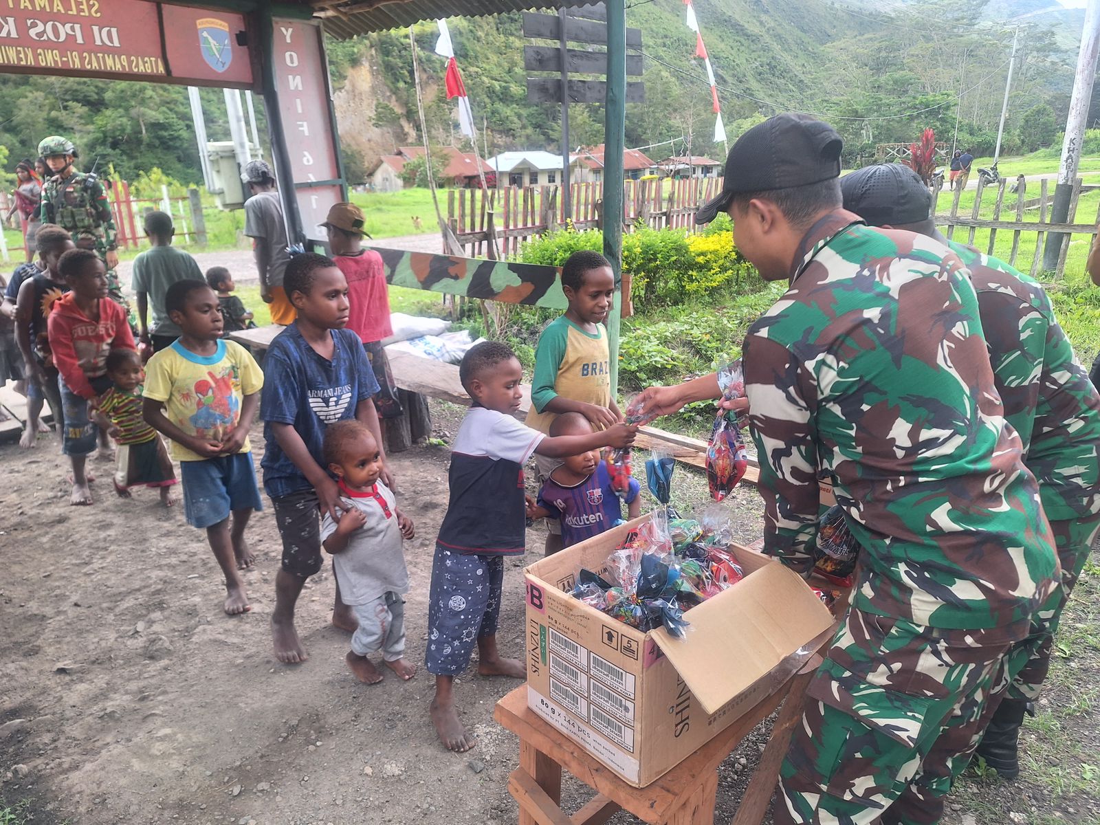 Yahukimo – Berbagi kebahagiaan kepada anak anak, Pos Kurima Satgas Yonif 641/Bru membagikan makanan ringan berupa snack kepada anak-anak Kampung Eroma, Distrik Kurima, Kabupaten Yahukimo, Provinsi Papua Pegunungan, (30/12/2024).