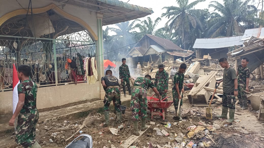 Aceh Tamiang – Satgas penanggulangan bencana Kodim 0117/Aceh Tamiang bersama Batalion TP 853/BRB bahu membahu bersama masyarakat melakukan pembersihan Meunasah Hasana di Dusun Kenanga, Desa Perdamaian, Kecamatan Kota Kuala Simpang, Kabupaten Aceh Tamiang. Rabu (31/12/2025).