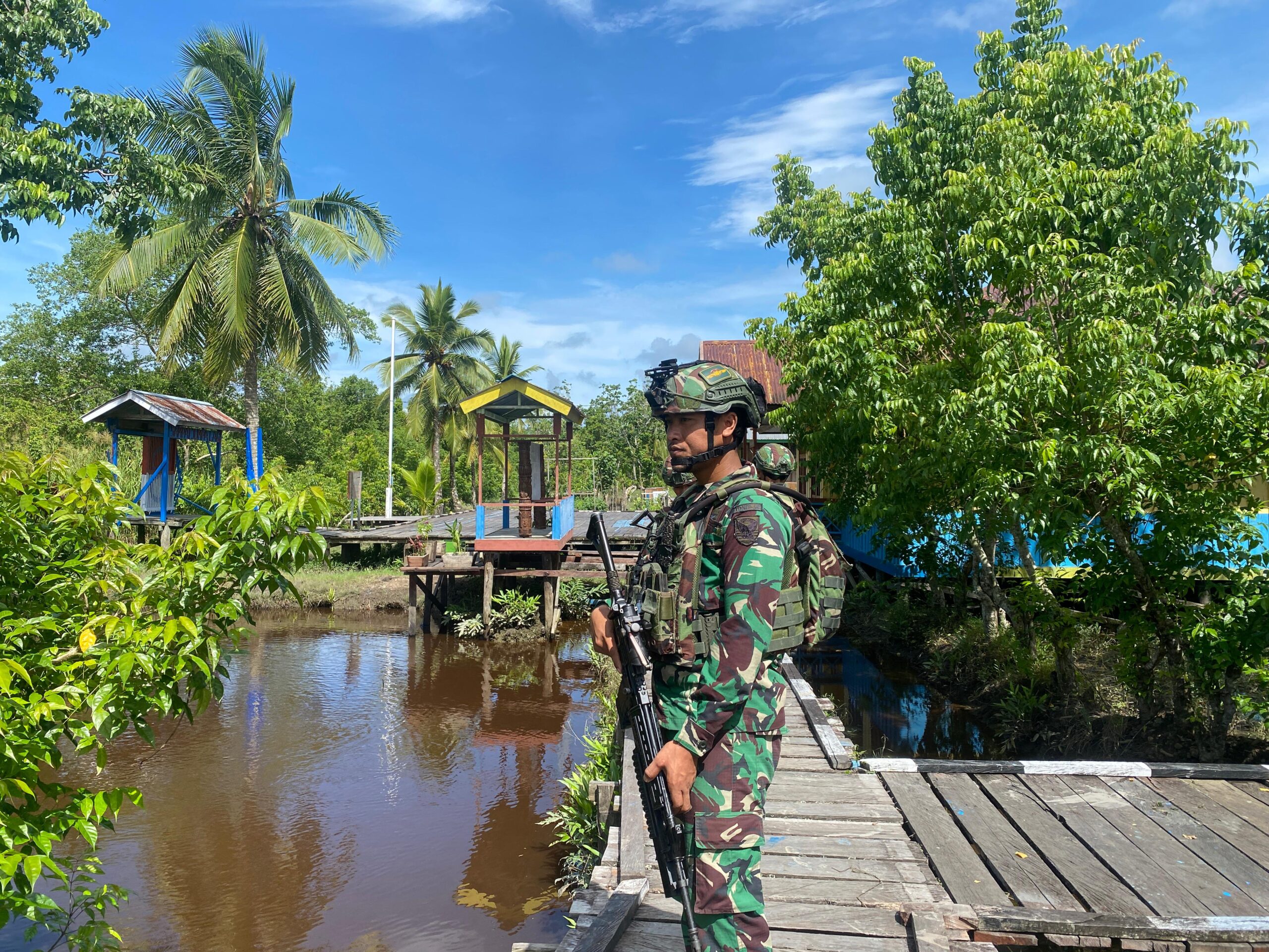Komandonews.com,Fayit–Dalam rangka menjaga keamanan dan ketertiban di wilayah Distrik Fayit, Kabupaten Asmat, Provinsi Papua Selatan, Satgas Pamtas Kewilayahan RI-PNG Yonif 141/AYJP Pos Fayit melaksanakan pengamanan ibadah umat Kristen Protestan pada Minggu (05/01/2025).