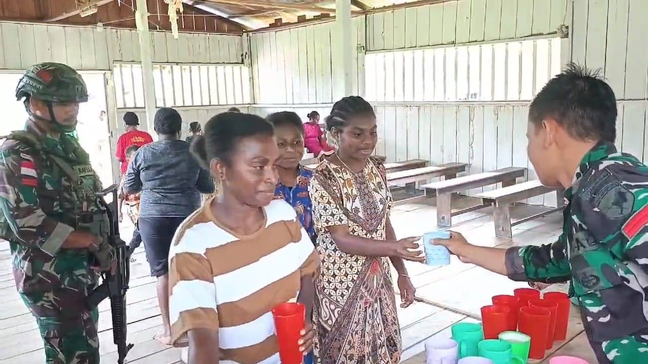Teluk Bintuni – Satgas Pamtas Kewilayahan Yonif 642/Kps, Pos Rawara melaksanakan program pemerintah yakni memberikan makan gratis yang dilaksanakan di Kampung Irahima, Distrik Moskona Selatan, Kabupaten Teluk Bintuni, Papua Barat. (10/12/2024).