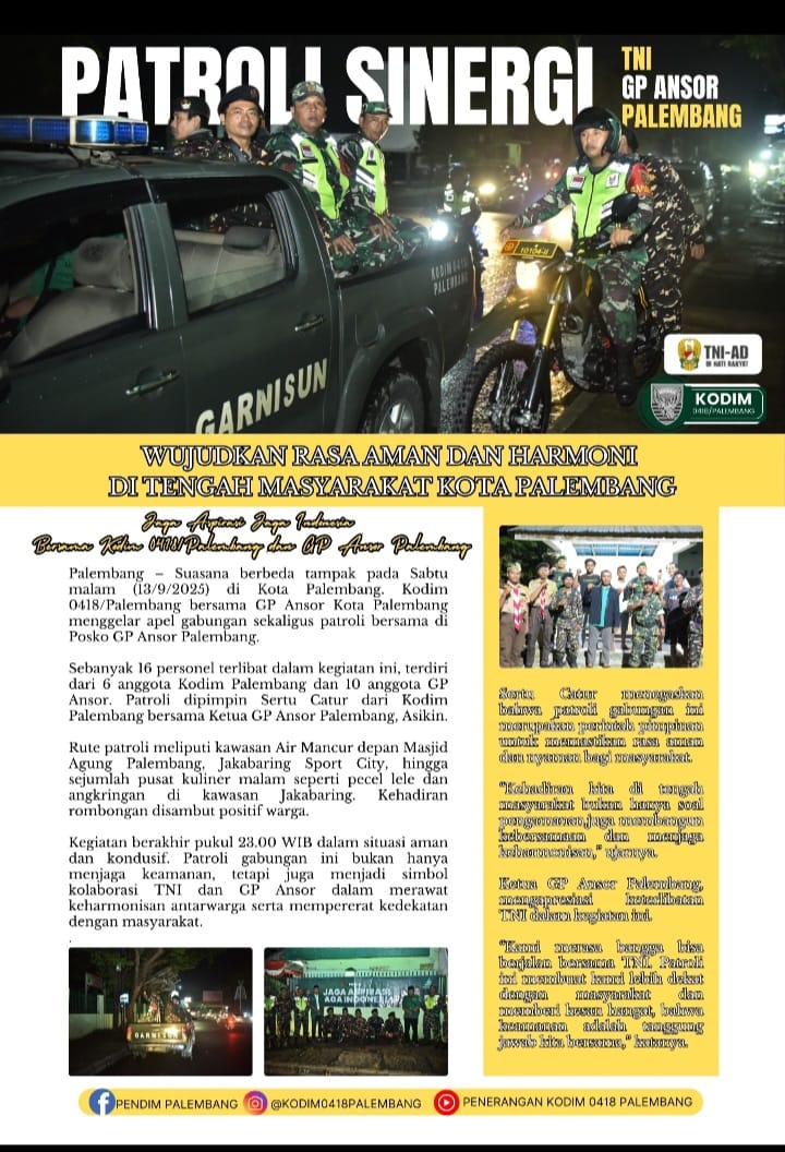 Komandonews.com,Palembang–Suasana berbeda tampak pada Sabtu malam (13/9/2025) di Kota Palembang. Kodim 0418/Palembang bersama GP Ansor Kota Palembang menggelar apel gabungan dan patroli bersama di Posko GP Ansor Palembang .
