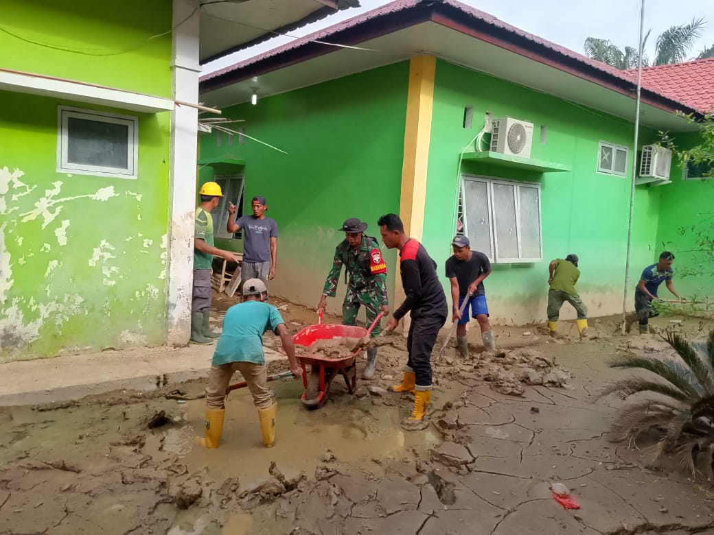 Aceh Tamiang – Anggota Koramil 06/Manyak Payed Bersama Satuan Brimob Polda NTB melaksanakan pembersihan sisa lumpur pascabanjir di Puskesmas Manyak Payed di Desa Tualang Baro, Kecamatan Manyak Payed, Kabupaten Aceh Tamiang. Kamis (08/01/2026).