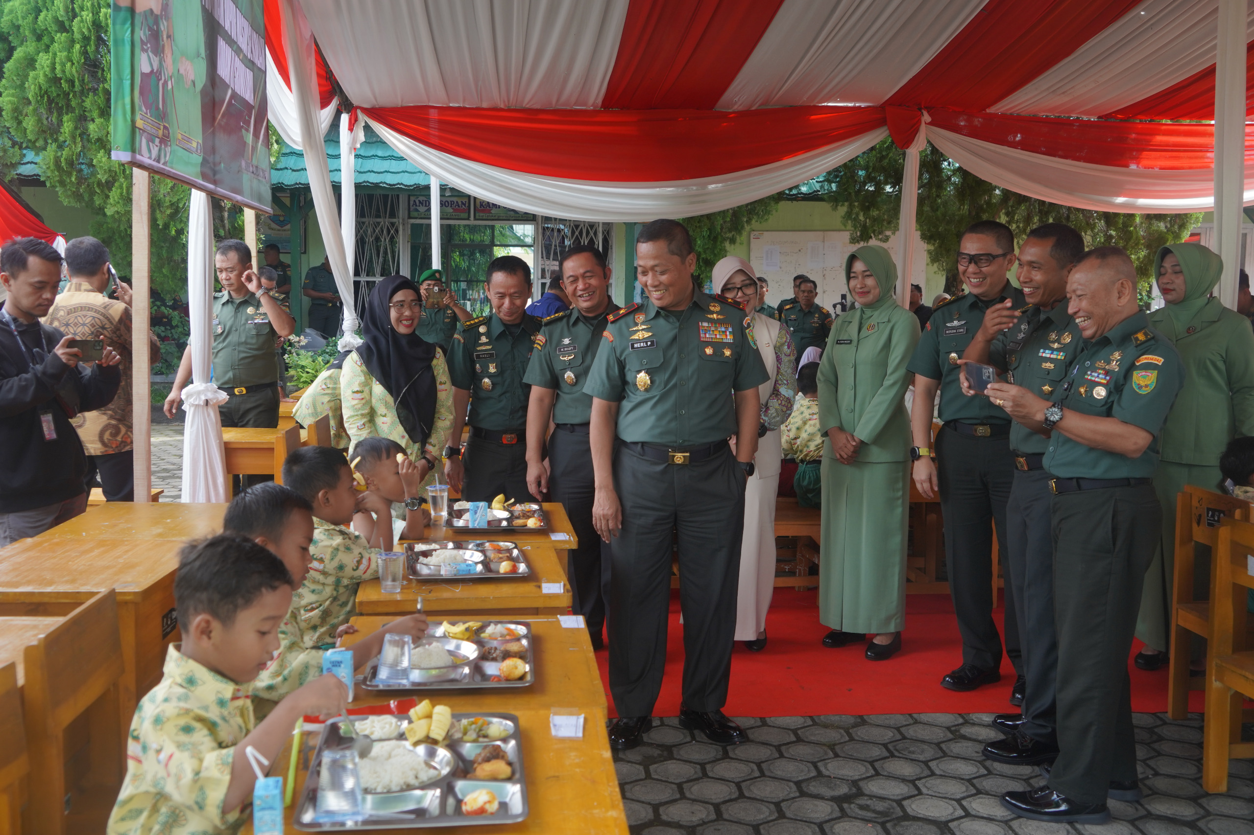 Danrem 042/Gapu Brigjen TNI Heri Purwanto, S.E., M.Sc., turut meninjau langsung pemberian makanan bergizi kepada siswa/siswi.