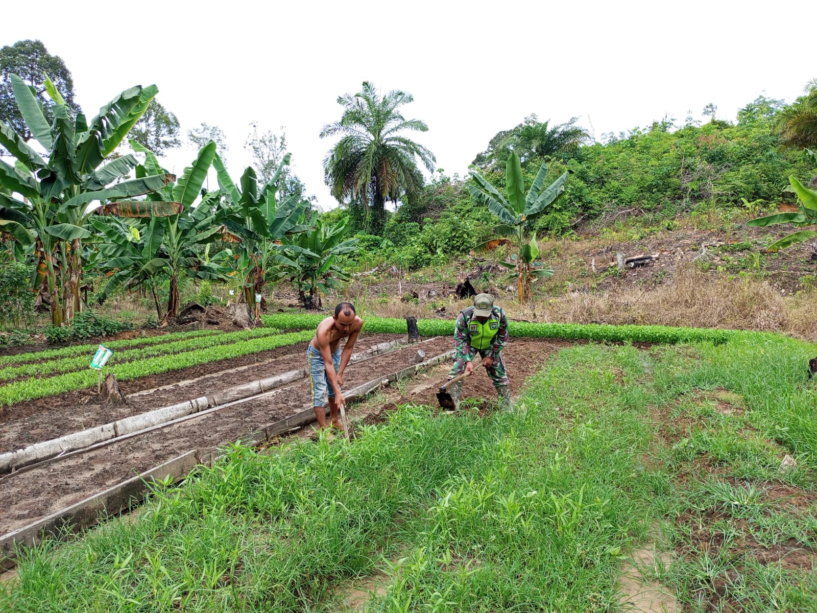 Serka Jumi’in mengatakan kita hari ini bersama Bapak Pairin melaksanakan olah lahan yang rencananya akan ditanami sayr. Tanpa canggung, Serka Jumi’in turun langsung membantu proses pengolahan tanah bersama pemilik lahan.