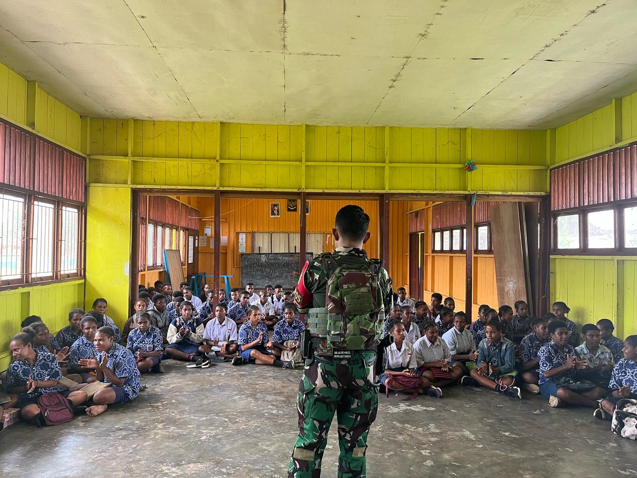 Komandonews.com,Mappi-Dalam rangka meningkatkan kesadaran dan kemampuan siswa dalam bidang pendidikan dan pembentukan karakter, Satgas kewilayahan RI-PNG Yonif 141/AYJP Pos Asgon Mengajar di Sekolah SMPN 1 Asgon, Kabupaten Mapii, Papua Selatan, Kamis (20/02/2025).