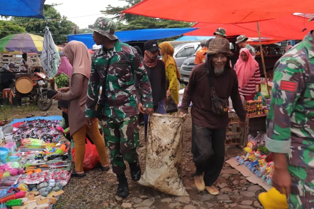 Komandonews.com,Lampung Utara-Satuan Tugas TNI Manunggal Membangun Desa (Satgas TMMD) ke-123 Kodim 0412/LU, dan masyarakat bergotong royong membersihkan sampah yang ada di lingkungan pasar tradisional menjelang bulan Ramadhan di Desa Subik Kec. Abung Tengah Kab. Lampung Utara. Kamis, (27/02/2025)