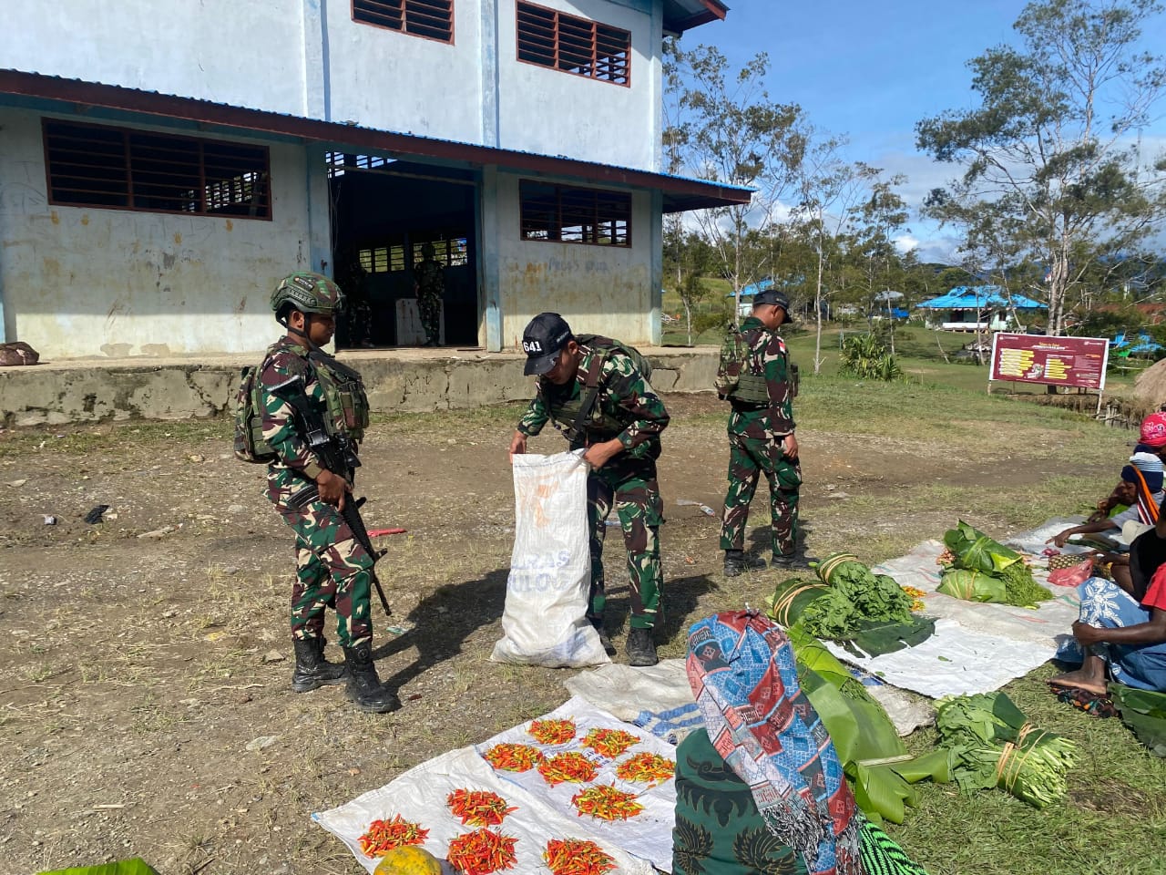 Membramo Tengah – Pos Eragayam Satgas Yonif 641/Bru bantu meningkatkan ekonomi masyarakat dengan memborong hasil tani mama – mama Papua yang berjualan di Distrik Eragayam, Kabupaten Membramo Tengah, Provinsi Papua Pergunungan, (08/12/2024).