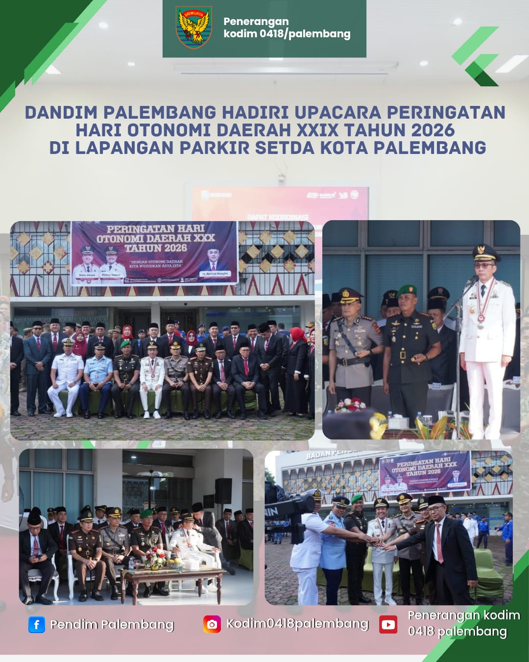 Sementara itu, Dandim 0418/Palembang Kolonel Arh Erik Novianto,S.sos menyampaikan bahwa momentum Hari Otonomi Daerah harus dimaknai sebagai penguatan sinergi antara pemerintah daerah dan seluruh elemen, termasuk TNI dan Polri.