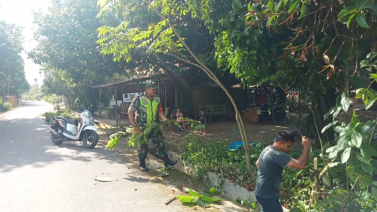 Aceh Tamiang – Upaya untuk memelihara jalan agar tetap bersih dan rapi, Babinsa Koramil 02/Karang Baru Serda Adi Syahputra bersama Perangkat Desa dan warga melaksanakan gotong royong membersihkan kiri kanan jalan di Desa Pahlawan, Kecamatan Karang Baru, Kabupaten Aceh Tamiang. Sabtu (01/11/2025).