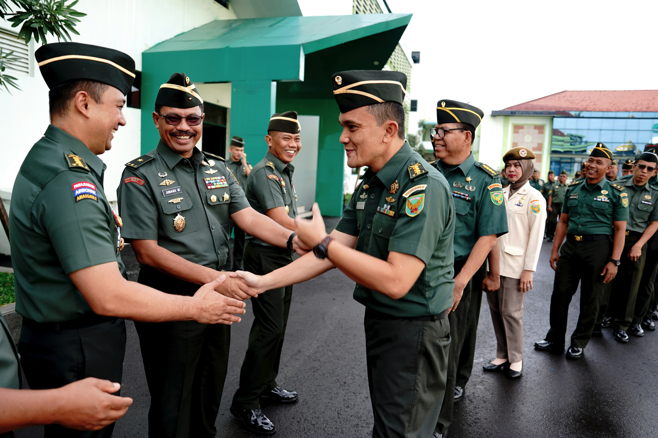 Usai menyampaikan sambutan singkatnya, dalam suasana kebersamaan dan penuh keakraban, dengan iringan lagu dan musik Islami, Brigjen TNI Triwahyu Mutaqin bersama para Pejabat Kodam II/Swj menerima jabat tangan dan ucapan “Selamat Hari Raya Idul Fitri” dari para prajurit dan PNS Makodam II/Swj.