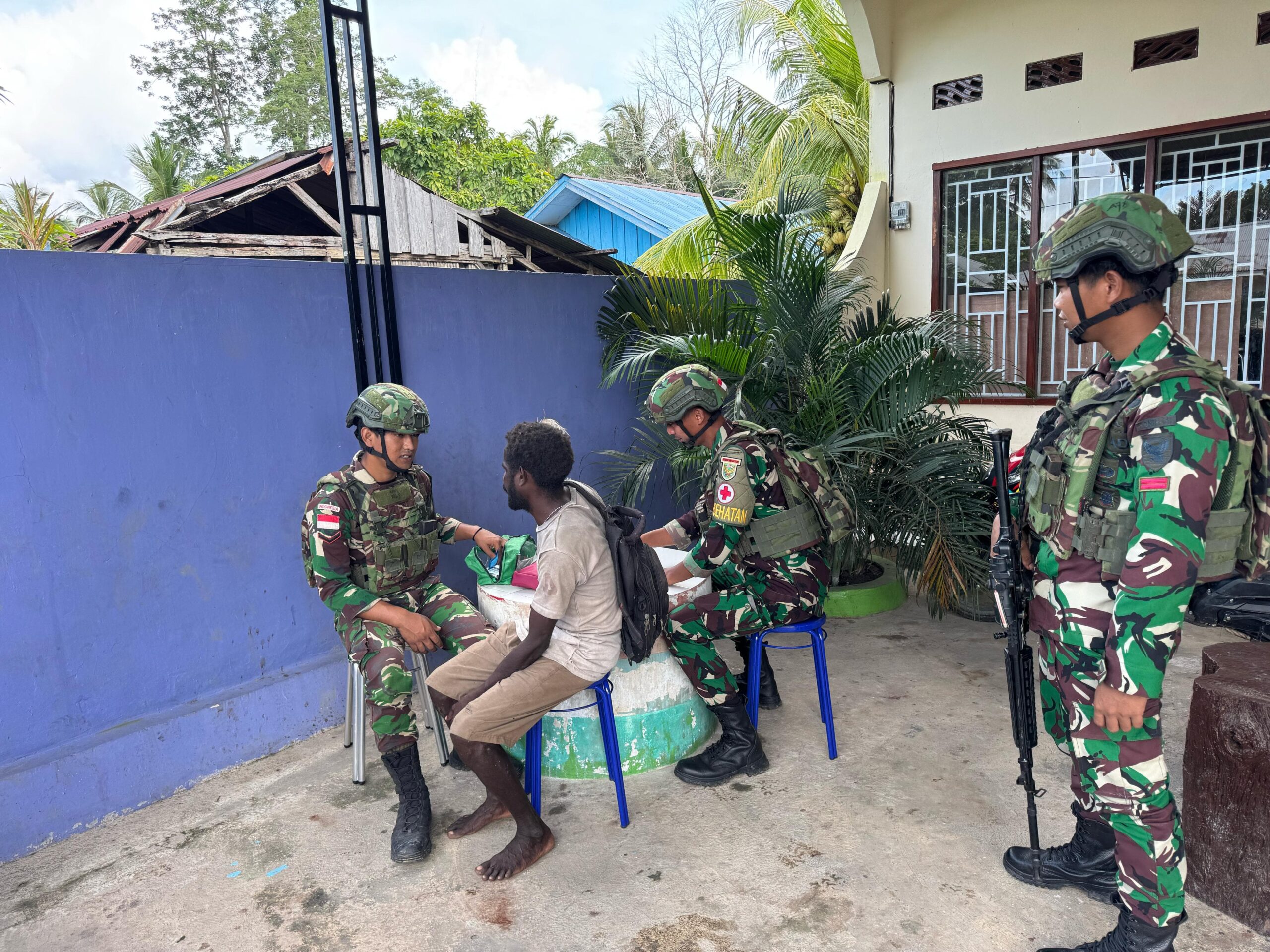 Komandonews.com,Marauke-Personil Satgas Kewilayahan RI-PNG Yonif 141/AYJP Pos Kimaam kembali menunjukkan kepeduliannya terhadap masyarakat perbatasan dengan melaksanakan kegiatan pelayanan kesehatan gratis di Distrik Kimaam, Kabupaten Merauke, Provinsi Papua Selatan. Jumat (25/04/2025)