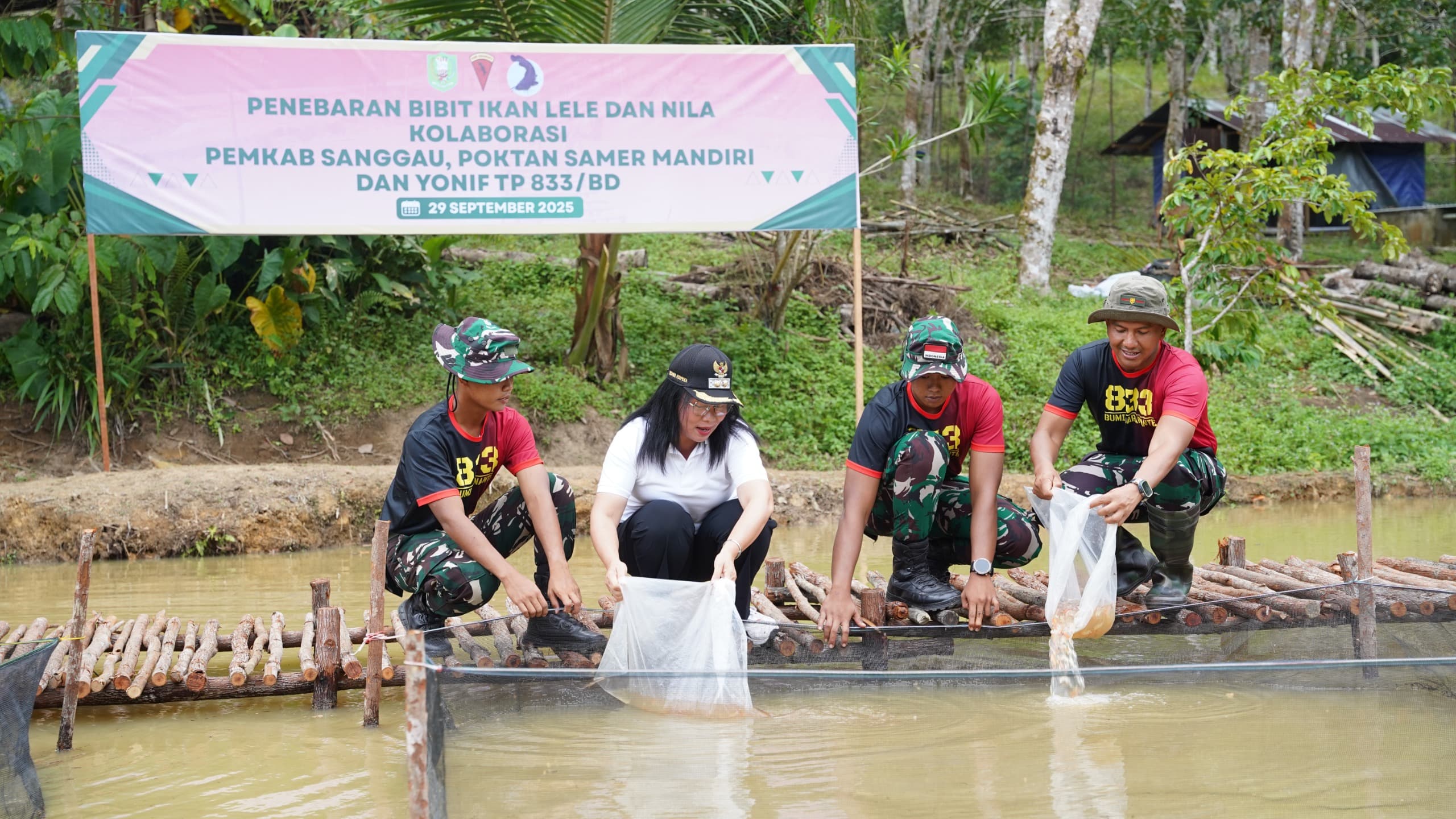 Sanggau – Yonif TP 833/Bumi Daranante berkolaborasi dengan Pemerintah Kabupaten Sanggau dan Kelompok Tani Sabang Merah Mandiri melaksanakan kegiatan penebaran bibit ikan lele dan nila sebagai wujud nyata kepedulian terhadap ketahanan pangan masyarakat.
